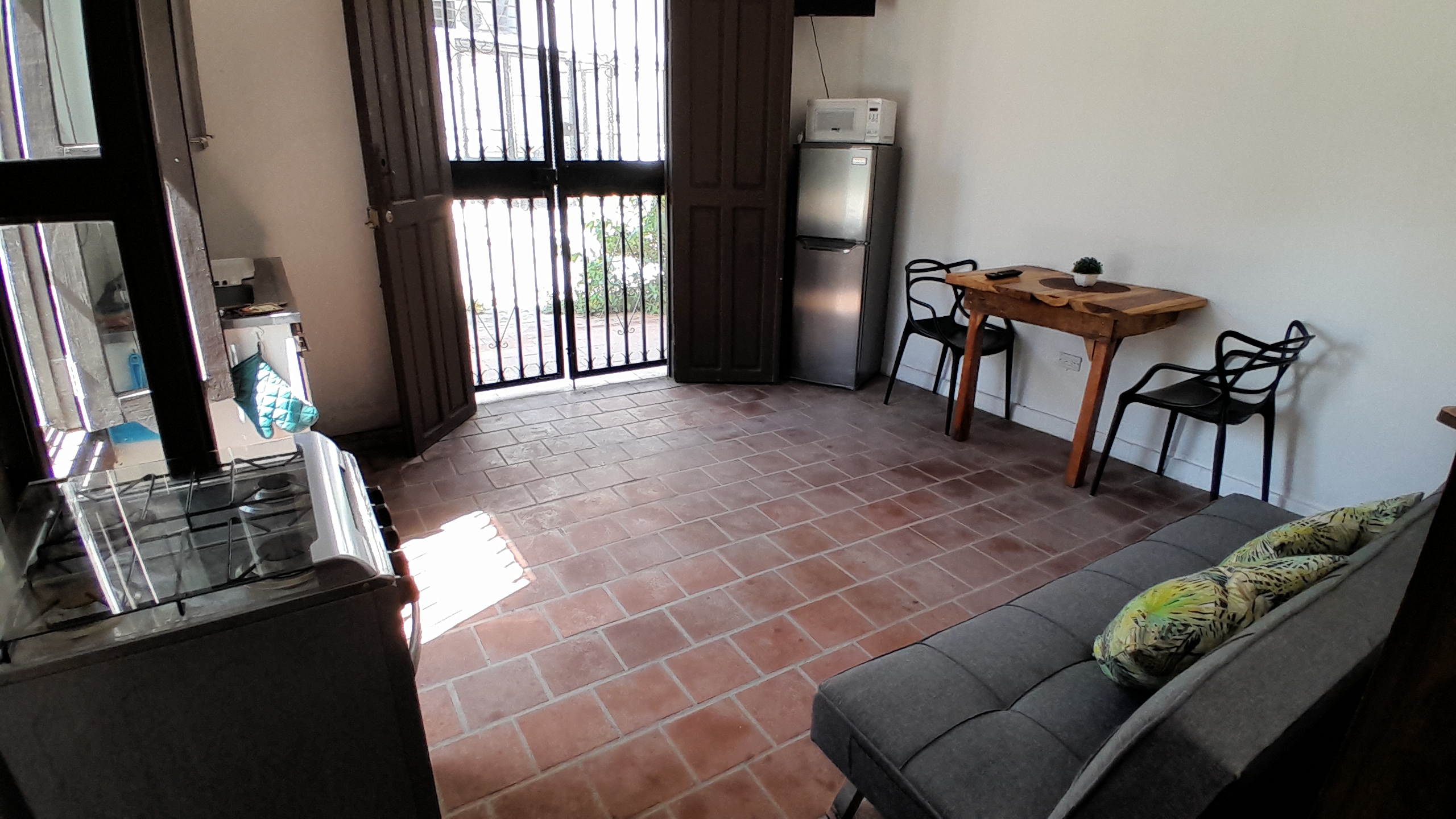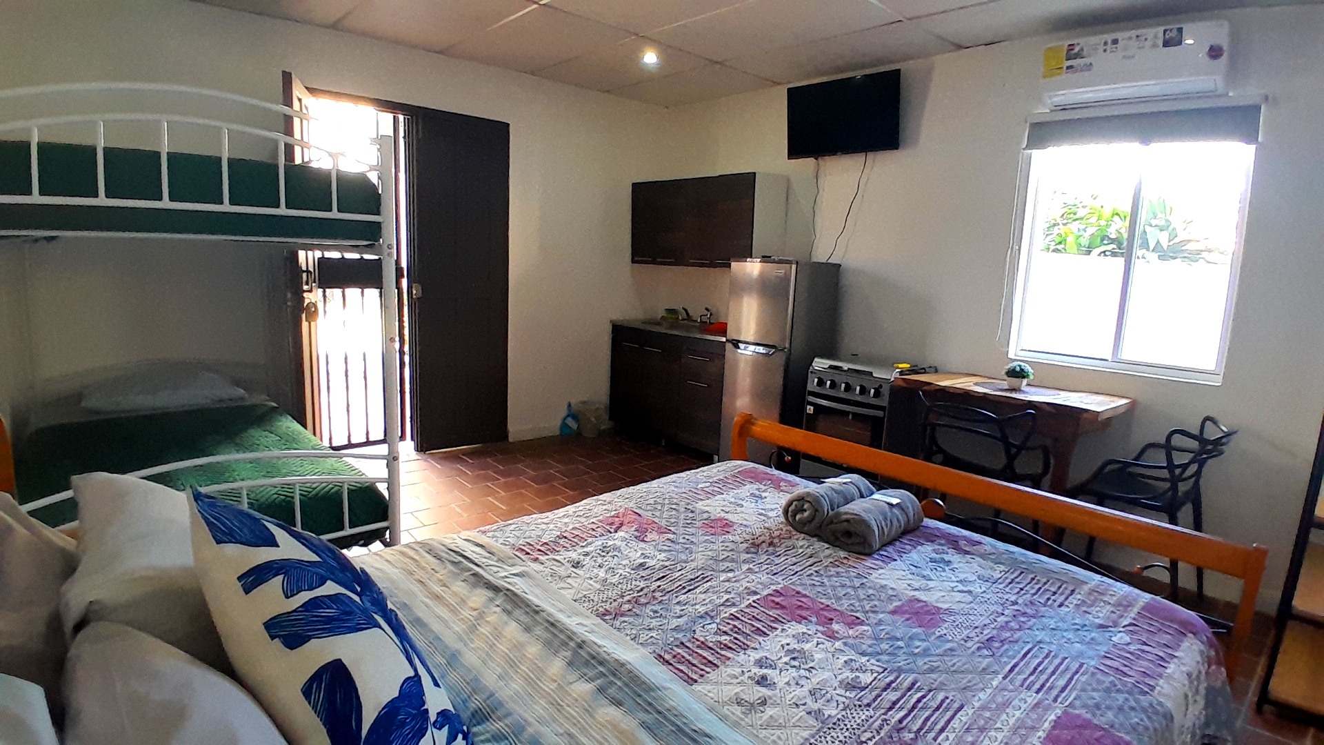 Enjoy our spacious Deluxe Apartment that is equipped with a private room with queen bed as well as a double bed and sofa bed in the living room perfect for couples, friends or families. AC, TV and WiFi included in the room, as well as a private bathroom with hot water. The kitchen is fully equipped with a stove/oven and fridge. The living room offers full park view as well as access to the private street and San Carlos Park view balcony.